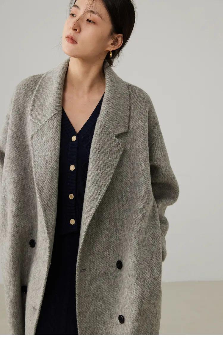 JUM这件简约的花灰色大衣,绵羊毛面料软糯,而且很好打理,不容易皱。