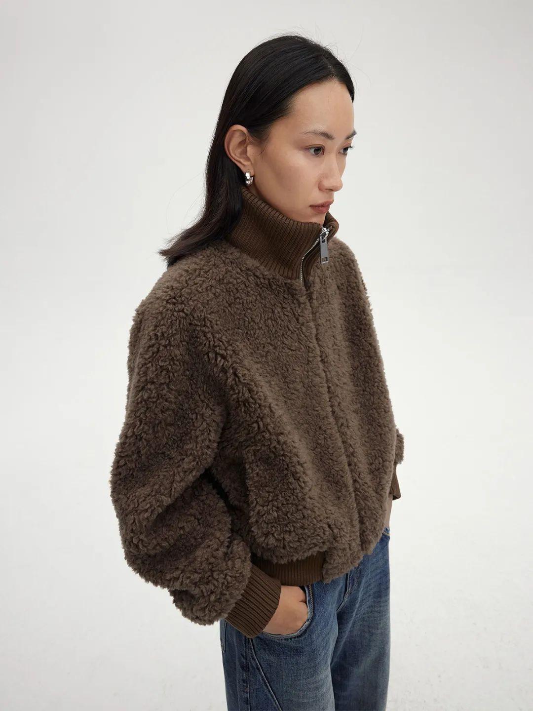 RandomPiece2022这款全羊毛麂皮绒的短款夹克,有点像棒球服的款式,上身蛮减龄的。