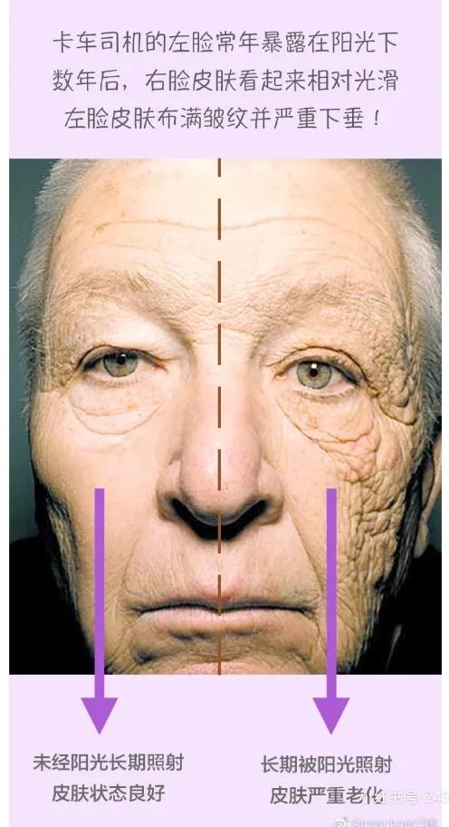 麦克利戈特的左脸,长时间在太阳底下暴晒,没有及时的防护,紫外线中的UVA和UVB会破坏皮肤的胶原蛋白,皮肤失去弹性,使肌肤快速衰老,两边脸部衰老程度相差20岁。