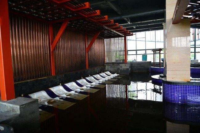 健身运动完,在这里的温泉中泡一泡。这里的温泉水源自底下2000米深处。共有25个功能各异的温泉池。每一个池边都有牌子注明池水的功效。泡上一会运动的酸胀缓解了不少呢。令人称奇是温泉鱼疗,我好奇的是那些小鱼们天天在热水里带着不热么:)