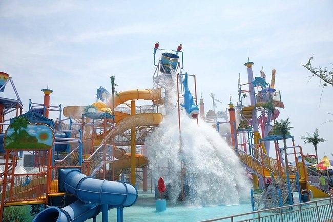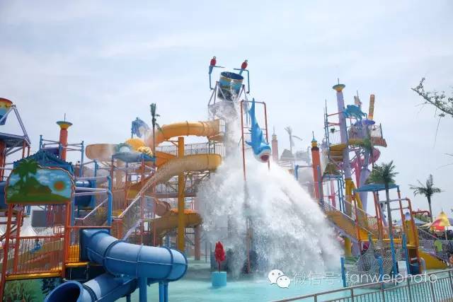 先被十米高的大桶倒下来的水来个透心凉吧!哈哈哈,让你顿时困意热意全都烟消云散。老范亲自在下面试了一下,将近十米高处的水落下来,砸在身上还是很有推背感的哈哈哈。建议小盆友不要轻易尝试哦。