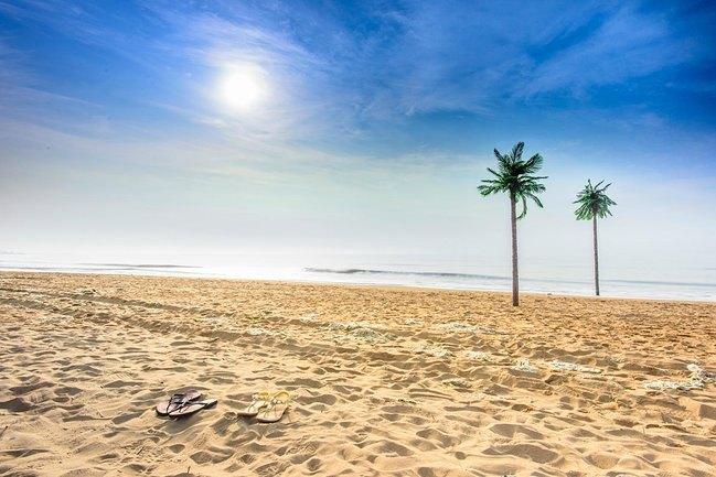 清晨的朝阳,金色的沙滩,碧蓝色的海水,还有不远处的两颗椰子树。