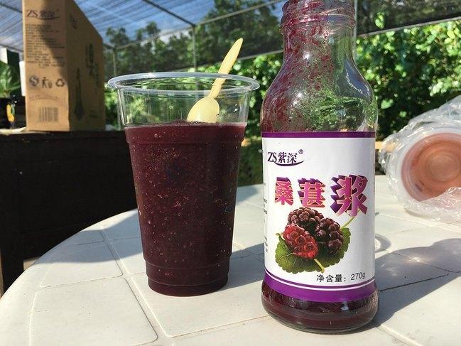紫深农场目前桑葚种植面积1600余亩,年产桑葚2300余吨。除了桑葚种植还做桑葚产品的深加工。这里的桑葚品种丰富,有适合吃的(偏甜),有适合酿酒的(微酸),还有白桑葚和富硒等品种。如果怕现摘的桑葚保存不了太久,可以购买加工好的桑葚果汁、果酱、果浆、酒等。 还有桑葚叶做成的茶。这些深加工产品都可以通过微信和淘宝直接下单,十分方便。