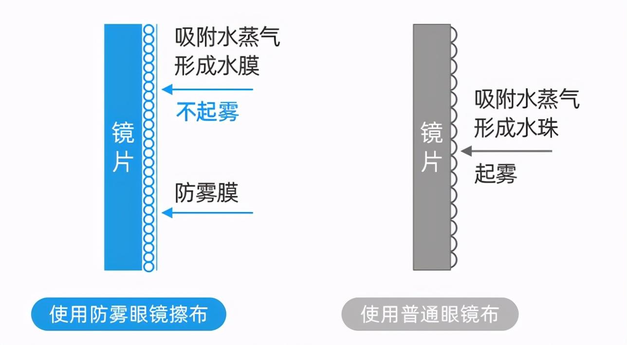 我们用眼镜布擦拭眼镜的时候,除雾剂会在镜片表面形成一层完全透明的保护膜,让水雾无法附着在镜片上。