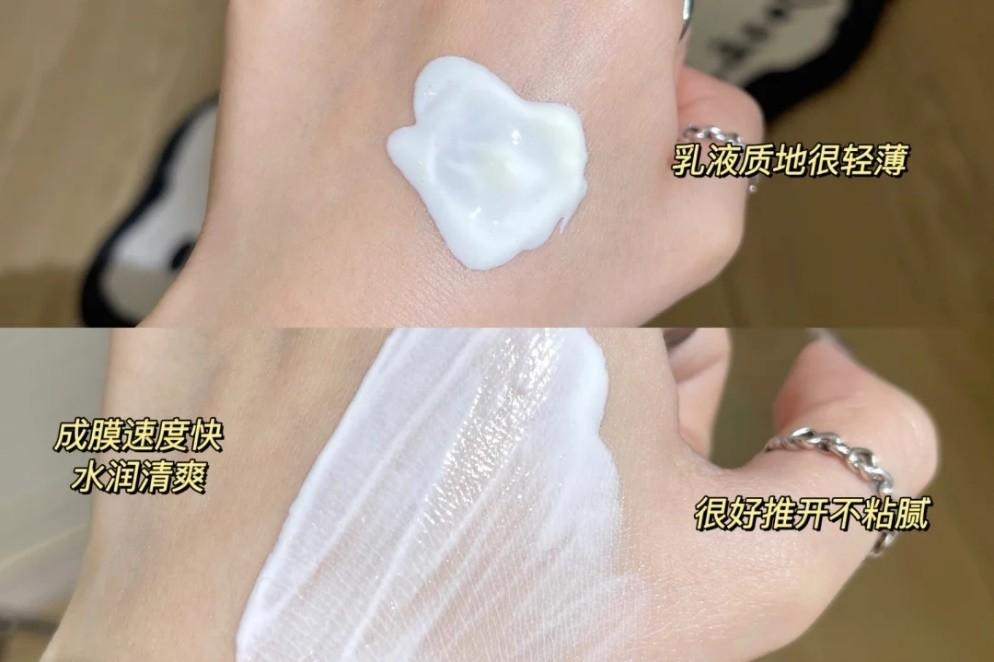乳液般质地,流动力中等比较容易涂均匀,上脸滋润度中等,肤感较为清爽,成膜速度快。成膜后在皮肤表面不泛白,后续叠加化妆品不易搓泥。