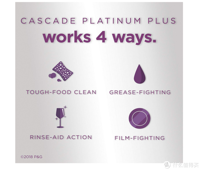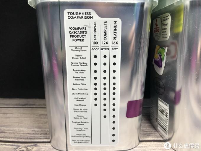 另一侧则是目前Cascade产品能力差异展示图,不光能看到洗涤效果是Best,并且增强了24小时食物固化后、烘焙餐具清洗,特别提到了金属餐具的光亮恢复能力,以及自带清洗洗碗机的能力。茶渍清洗和玻璃光亮效果等就不多说了,普通的Cascade也有。看到这里再次认为16X是代表16种能力,结果一数才15个点,除非是算上了第一个列的总体清洗能力。