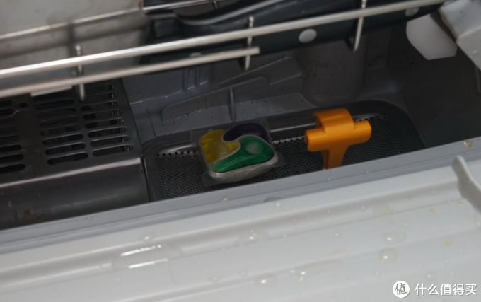 这款产品的外面是水溶膜,并且因为里面是液体和粉末,比亮碟洗碗块更容易溶解。在洗碗机注水没多久刚运转起来时,我打开了仓门进行了一次观察,溶解效果好。