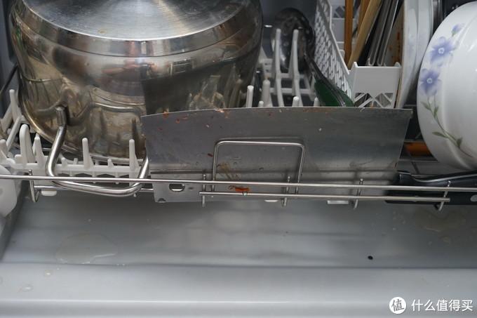 首先展示的是放在外侧的钢菜刀,虽然上面的牛油已经洗涤的干净了,但与我理想中可以把钢刀洗的亮闪闪还是有些差距,还是有些暗淡。细看主要是有很多磨损的细条纹,洗碗机也不能起到打磨的作用,这点也能理解。