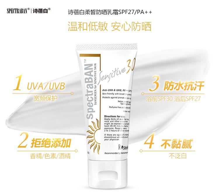四种化学防晒,外加一些保湿剂,舒缓抗炎和抗氧化成分,防护波段,不含酒精,香精,适合干皮,敏感皮。