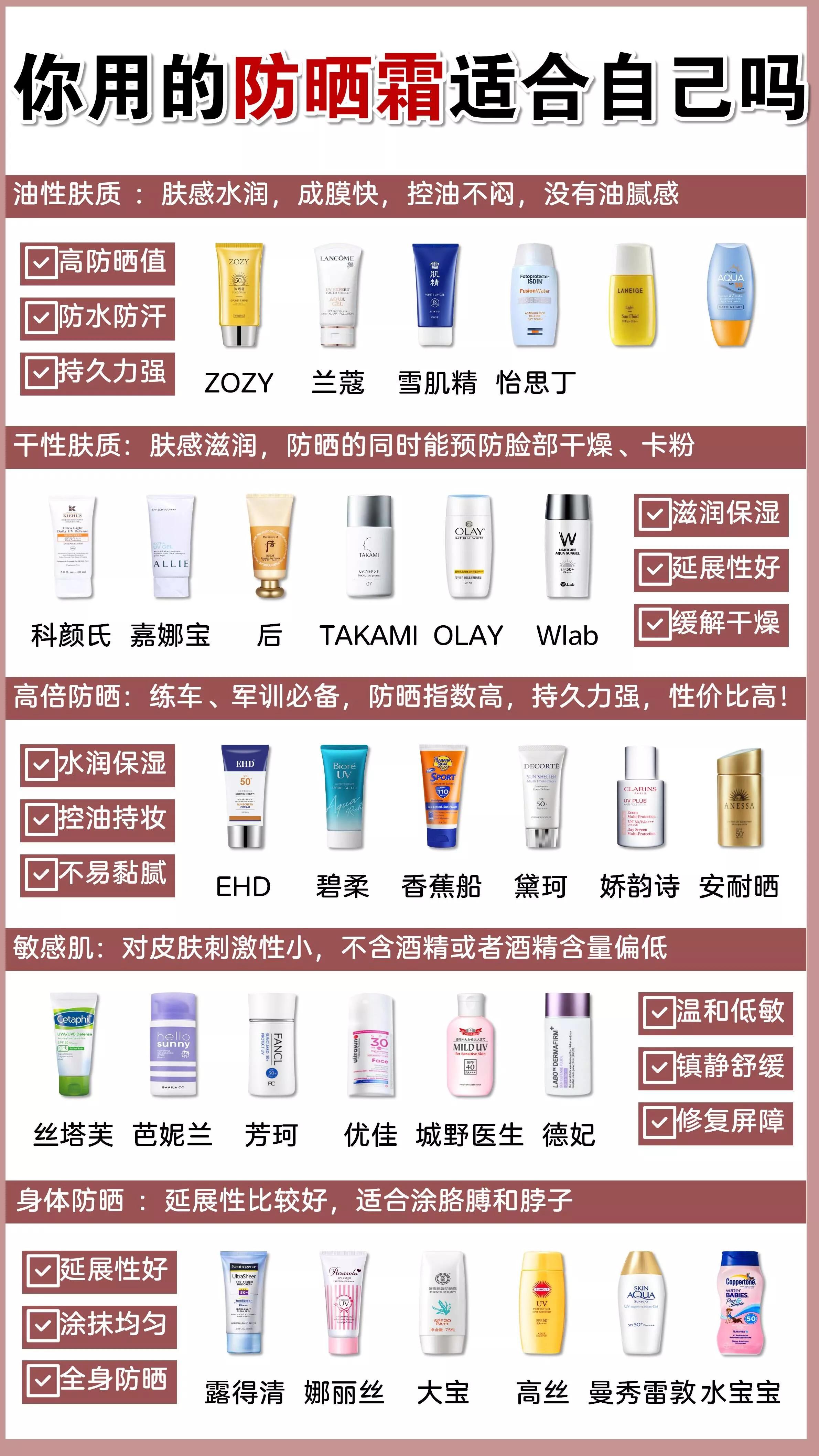 敏感肌、油痘皮:怡丽丝尔、Ultrasun、蓝胖子