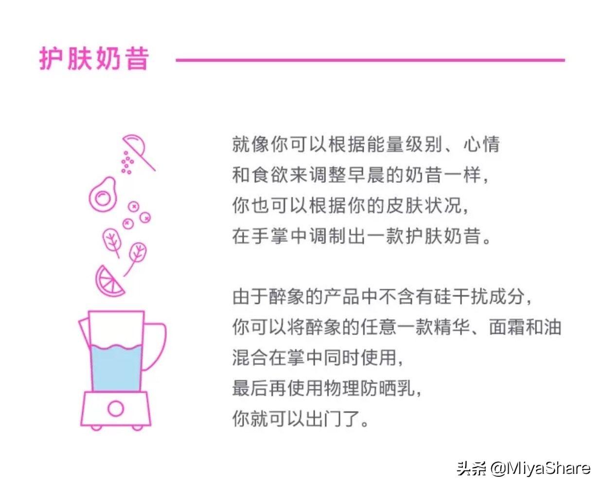 首先和大多数强调干皮、油皮护肤理念不同,醉象所有产品并没有明确的干皮油皮划分。之前Miya也多次强调:所谓的干皮、油皮只是皮肤在某个阶段做表现的皮肤状态。没有人是永远干皮或永远油皮。而醉象的护肤理念讲究搭配,也就是品牌自己所传递的“护肤奶昔”方法。所有产品可以根据皮肤状况和需求随意搭配。
