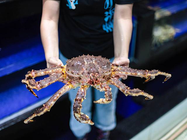 走进小海豚,先要在一楼大厅选食材,这是一家专门吃海鲜的餐厅,一楼大厅摆满了大大小小的缸,各种能吃的海洋生物在这里开大会,活蹦乱跳的迎接我们的到来,尤其看这帝王蟹,新鲜生猛活力十足。