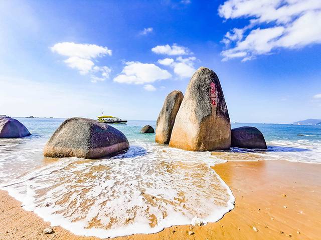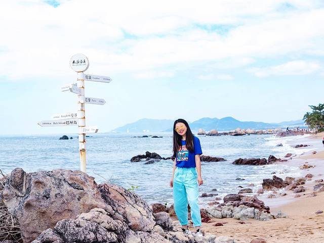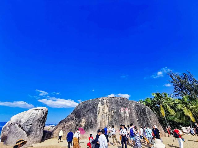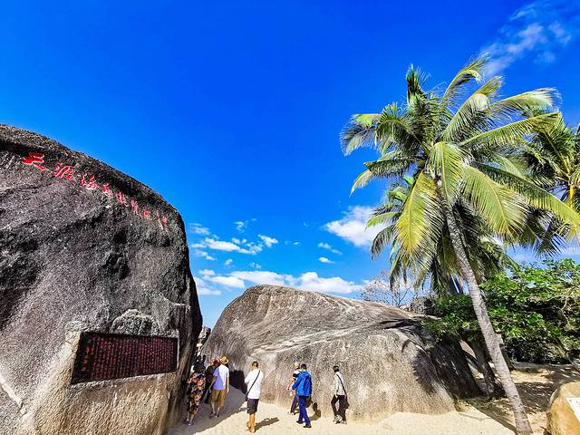 财富石,是南天一柱,也是很有寓意,代表着财富。民间流传一个香港富商生意落败后,与石头亲密接触后,回香港生意重新经营红火起来。 和老公在此留影。“天涯”和“海角”这两块大石头也是有来历的, 传说一对热恋的男女分别来自两个有世仇的家族, 他们的爱情遭到各自族人的反对,于是被迫逃到此地双双跳进大海,化成两块巨石,永远相对。后人为纪念他们的坚贞爱情,刻下“天涯”“海角”的字样。感人的爱情故事,天涯海角永相随。