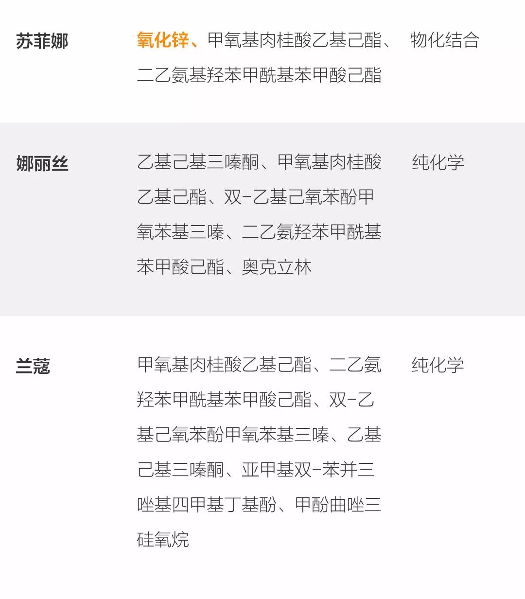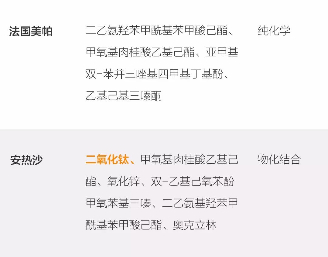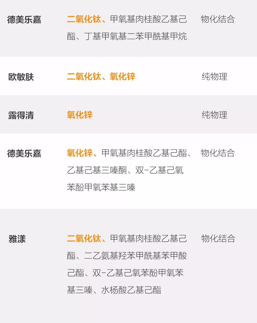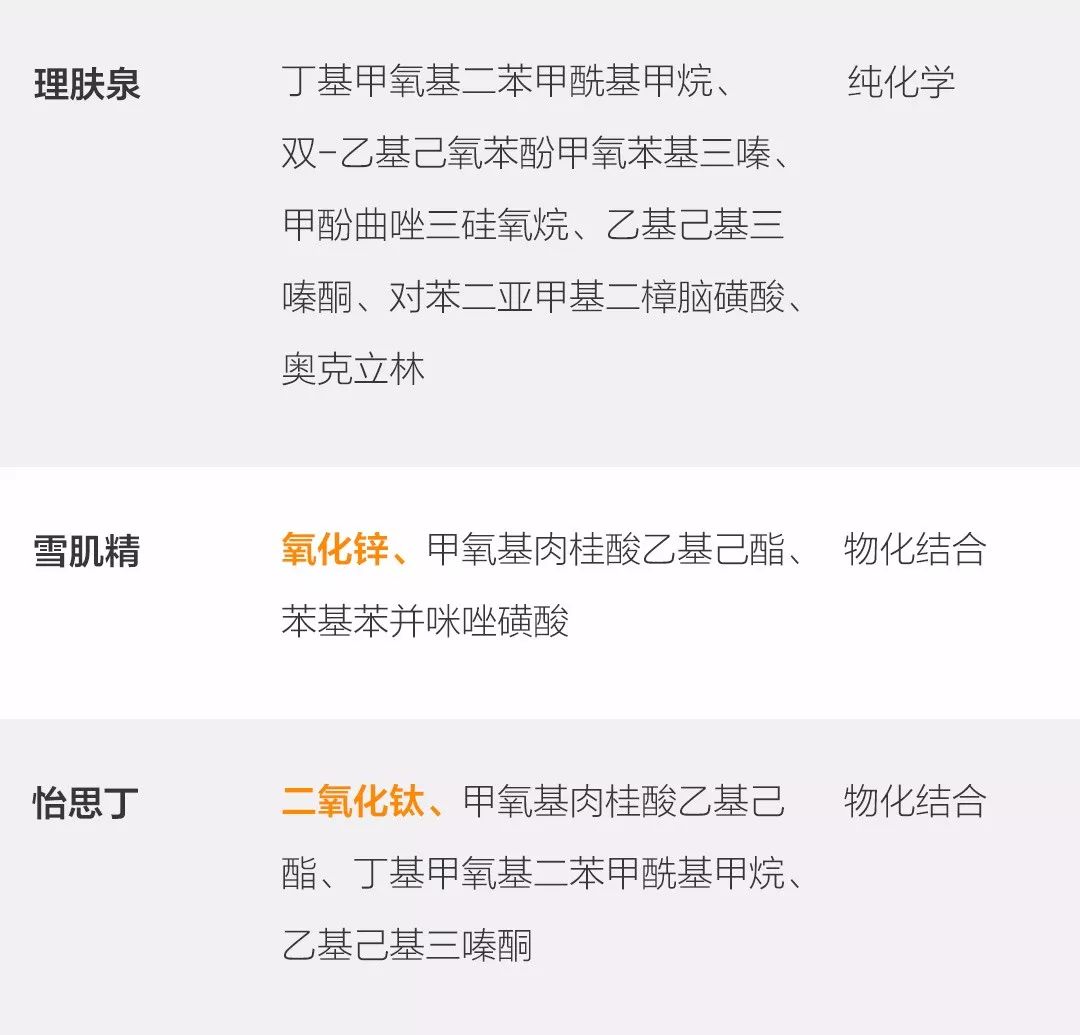 有成分一般有:二苯甲酰甲烷、二苯甲酮、二甲基辛脂、对氨基苄酸(这个就是挺时髦的PARA)、肉桂酸盐、二羟基丙酮、苯酚类,还有药物消炎痛。一些产品通常是在香料添加成分等添加剂和工艺上的差别。
