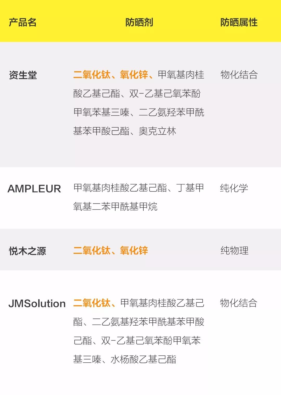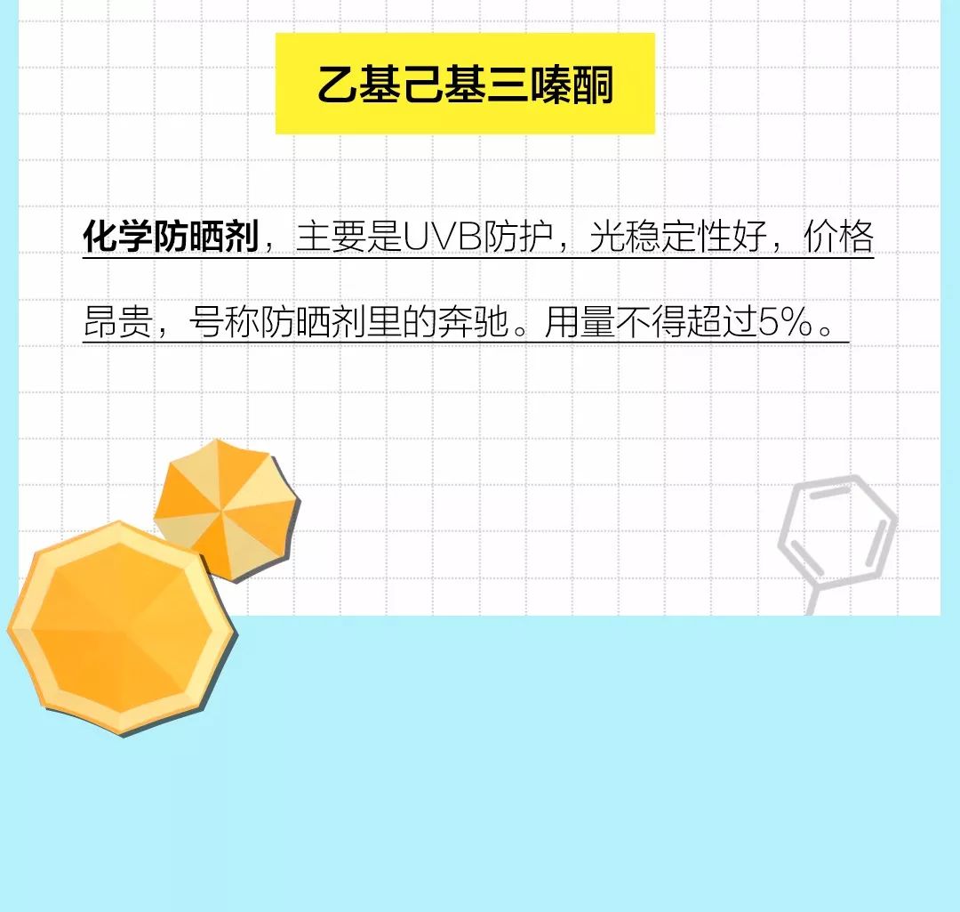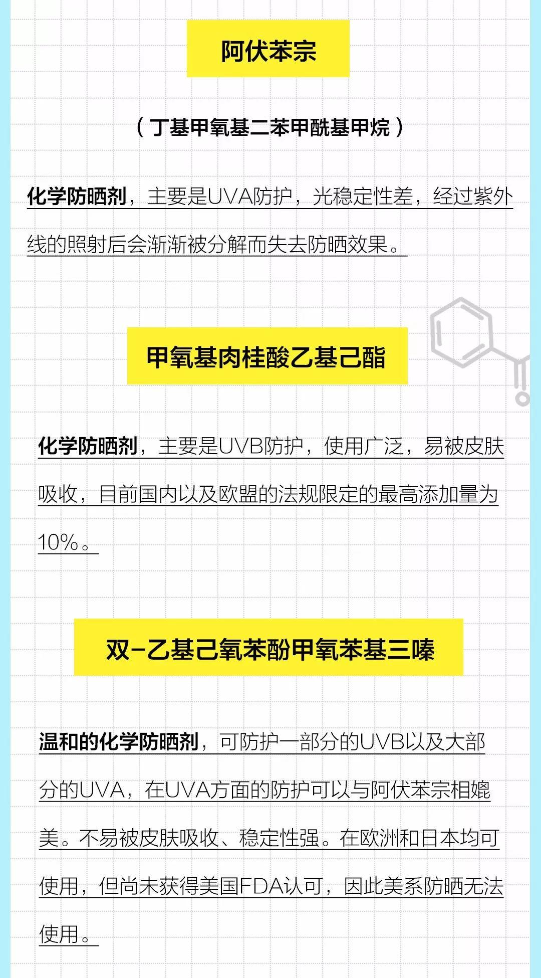 有成分一般有:二苯甲酰甲烷、二苯甲酮、二甲基辛脂、对氨基苄酸(这个就是挺时髦的PARA)、肉桂酸盐、二羟基丙酮、苯酚类,还有药物消炎痛。一些产品通常是在香料添加成分等添加剂和工艺上的差别。