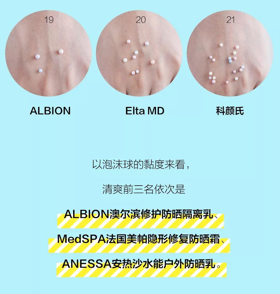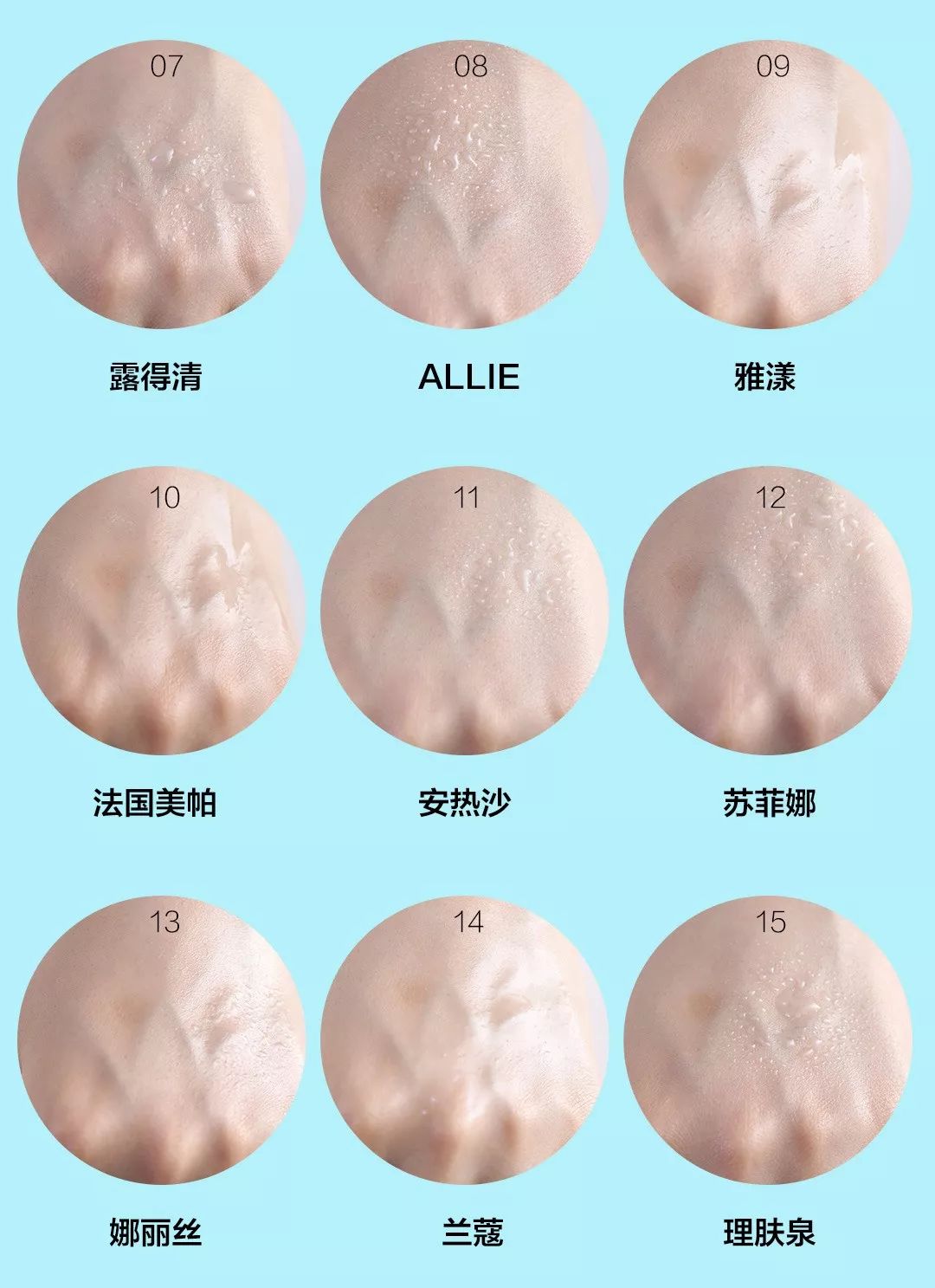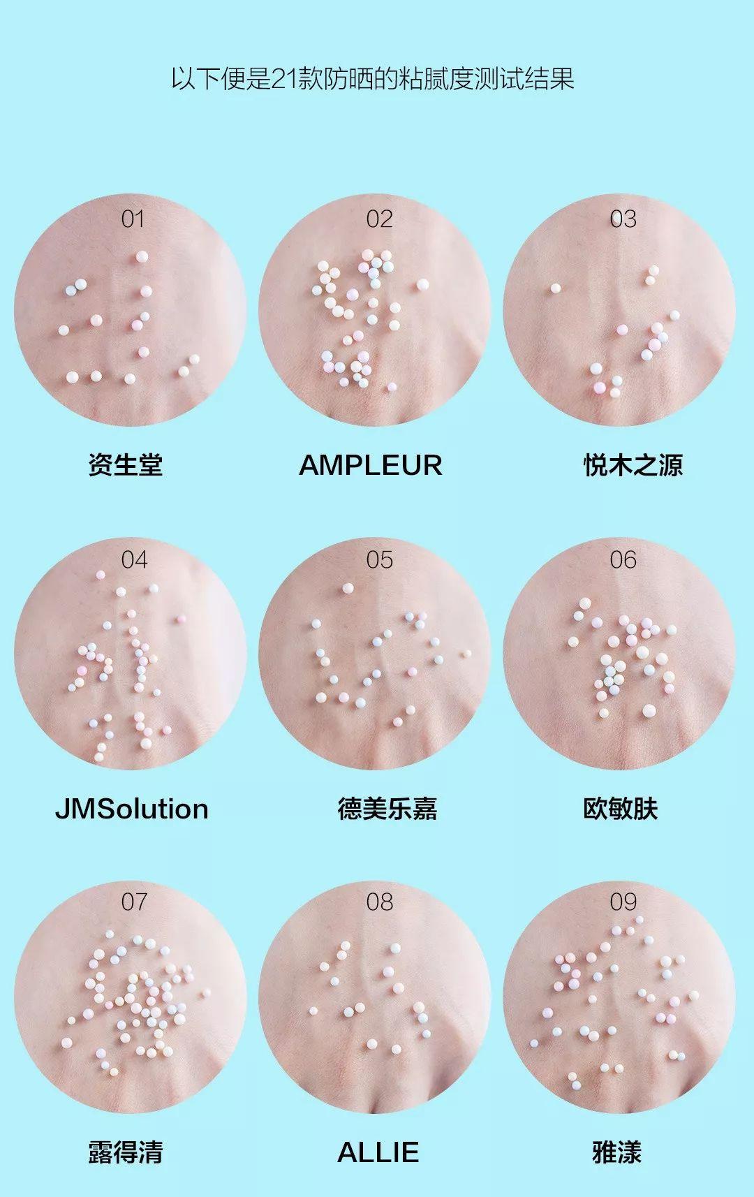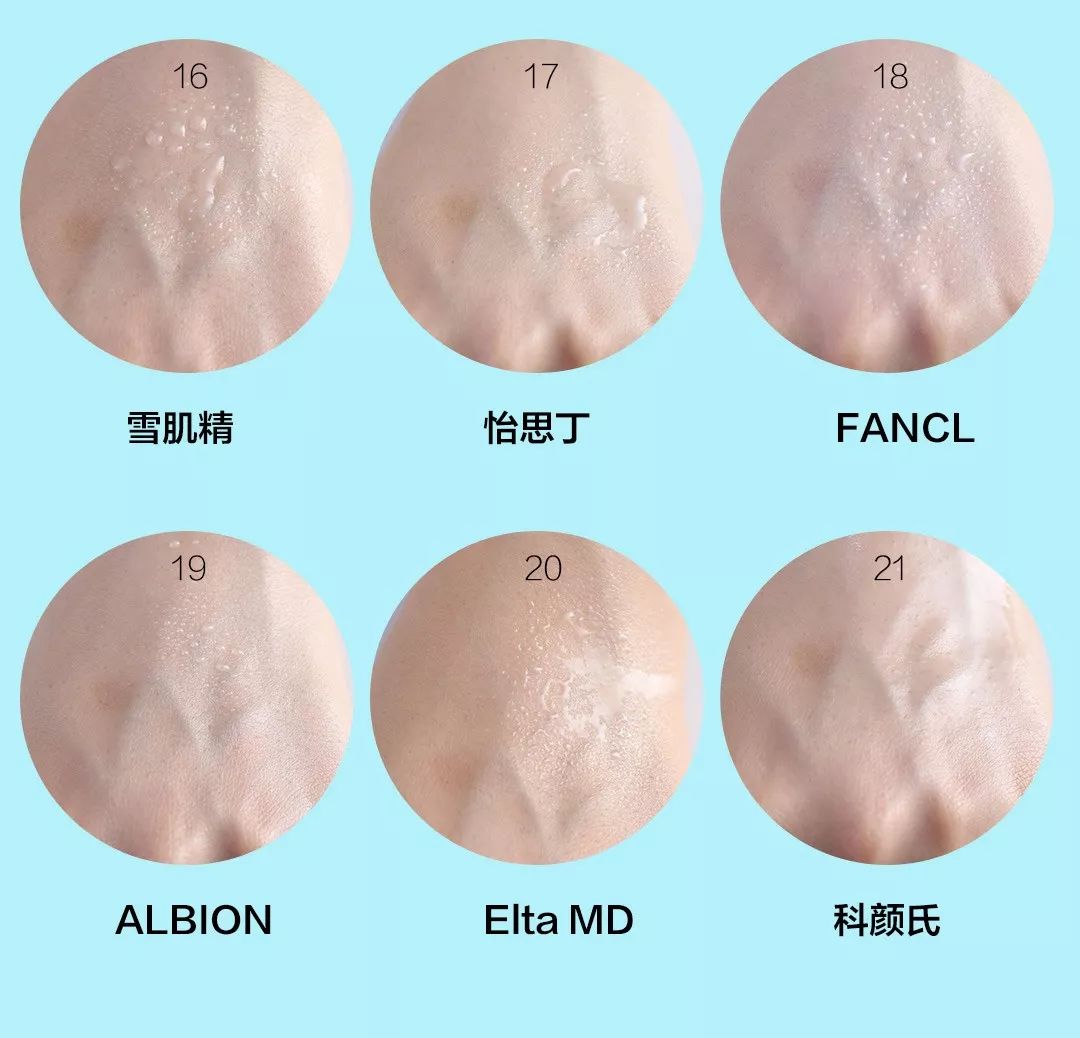 综合粘腻度和质地测试可以看出摇摇乐类的防晒霜整体清爽、不黏腻、吸收快(以资生堂、悦木之源、Fancl等为代表);而成膜感且好的,粘腻感也更一些(以JM、理肤泉等为代表)。纯物理防晒(露得清)容易泛白,日系防晒(SOFINA、雪肌精)都带有微微提亮的妆。