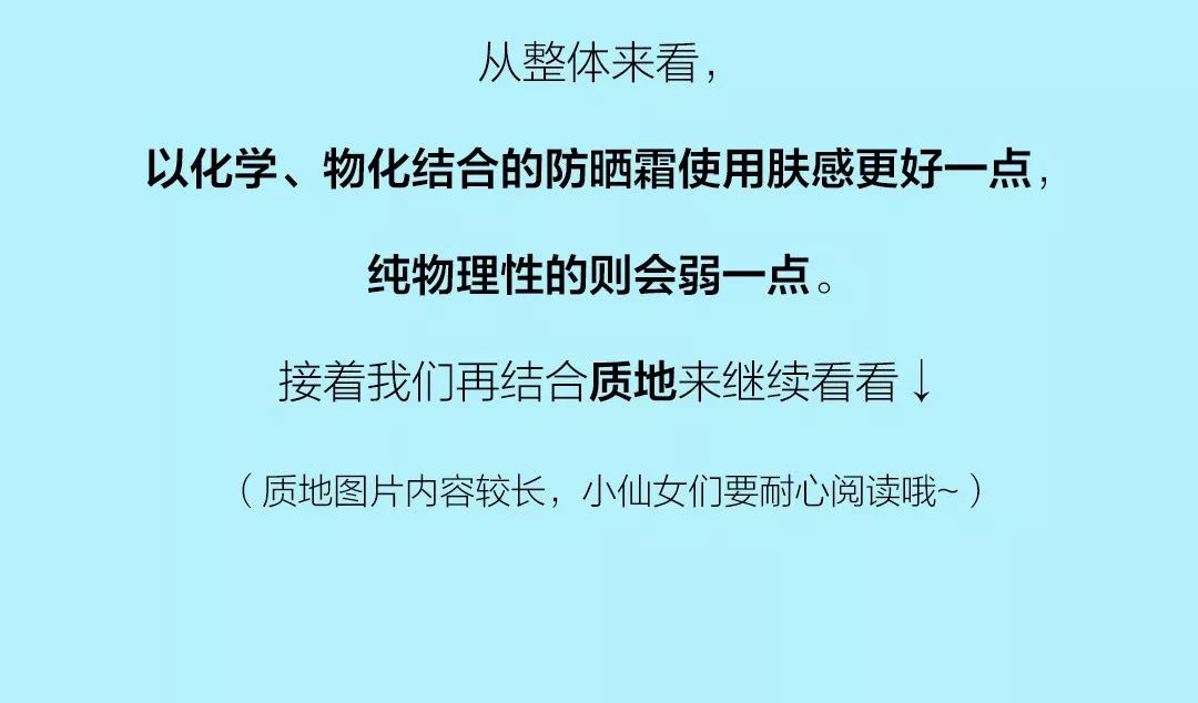 当然,我们并不赞成用单纯一刀切的方式来把肤质和产品选择这么简单、粗暴地一一对应起来,毕竟,在产品选择这件事上存在大的个体差异,每个人的皮肤状态不同、护肤流程不同、个体感受不同,对防晒霜的容忍程度不同,也要结合实际情况加以判断。