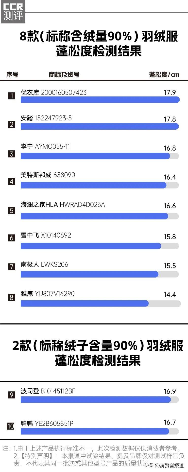 此次检测的10款羽绒服均为鸭绒,结果显示,优衣库、安踏蓬松度高,分别高达17.9cm和17.8cm,而南极人、雅鹿差强人意,仅为15.5cm和14.4cm。