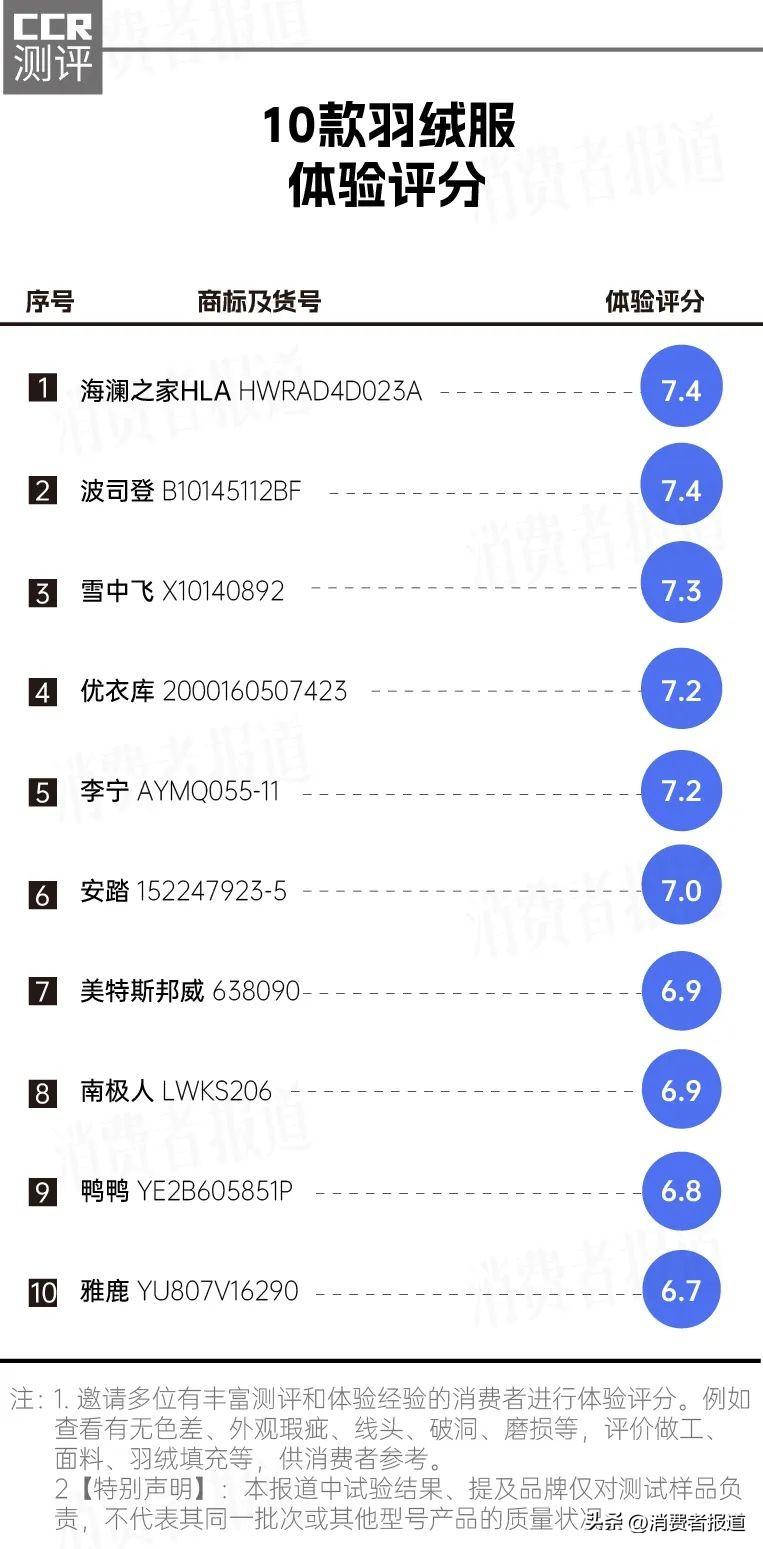 本刊邀请多位有丰富测评和体验经验的消费者进行体验评分。例如查看有无色差、外观瑕疵、线头、破洞、磨损等,评价做工、面料、羽绒填充等,供消费者参考。