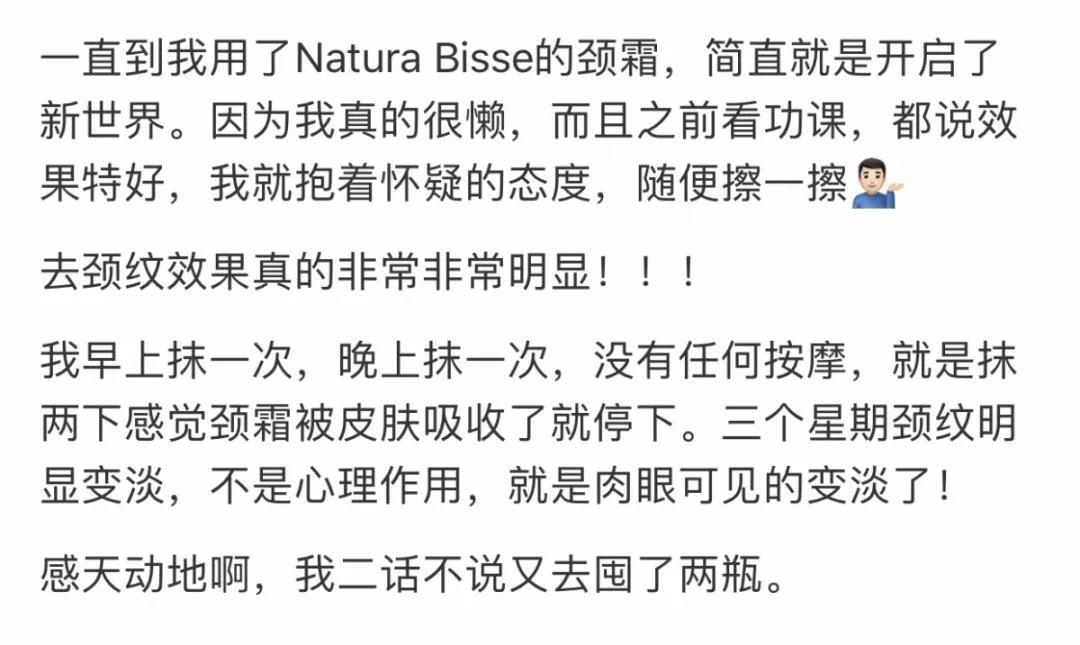 Natura Bisse的颈霜也是明星产品,据说娇韵诗和资生堂悦薇,淡化颈纹的果十分。它的质地很扎实,倒扣都不会掉下来那种,吸收很快,号称是微注射的替代选择,除了去颈纹之外,还有提亮脖子肤色的作用,脖子肉眼可见的变白!塑造颈部线条,消除双下巴都有用。的缺点,贵!
