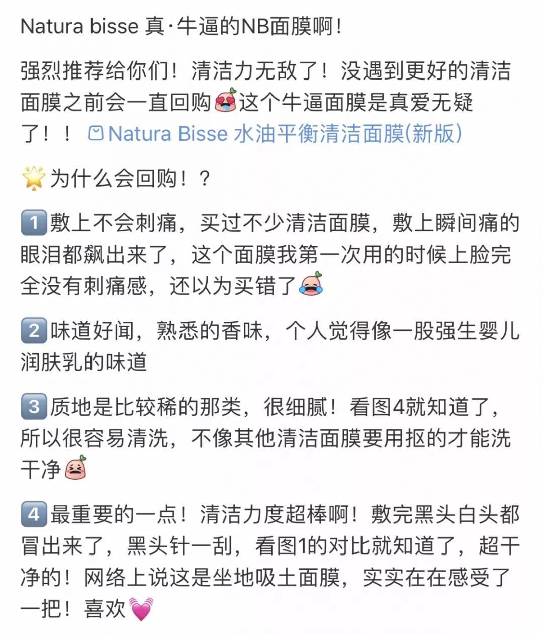 这款Natura Bisse净透洁肤面膜又叫“抛光面膜”,传说有“坐地吸土”的功,所以也被笑称“NB面膜”,好多人说是用过好用的清洁面膜。敷起来是泥膜,洗的时候就变成洗面奶了,延展性特别好,10min-15min可以洗掉,是包含卸妆果的深层清洁。