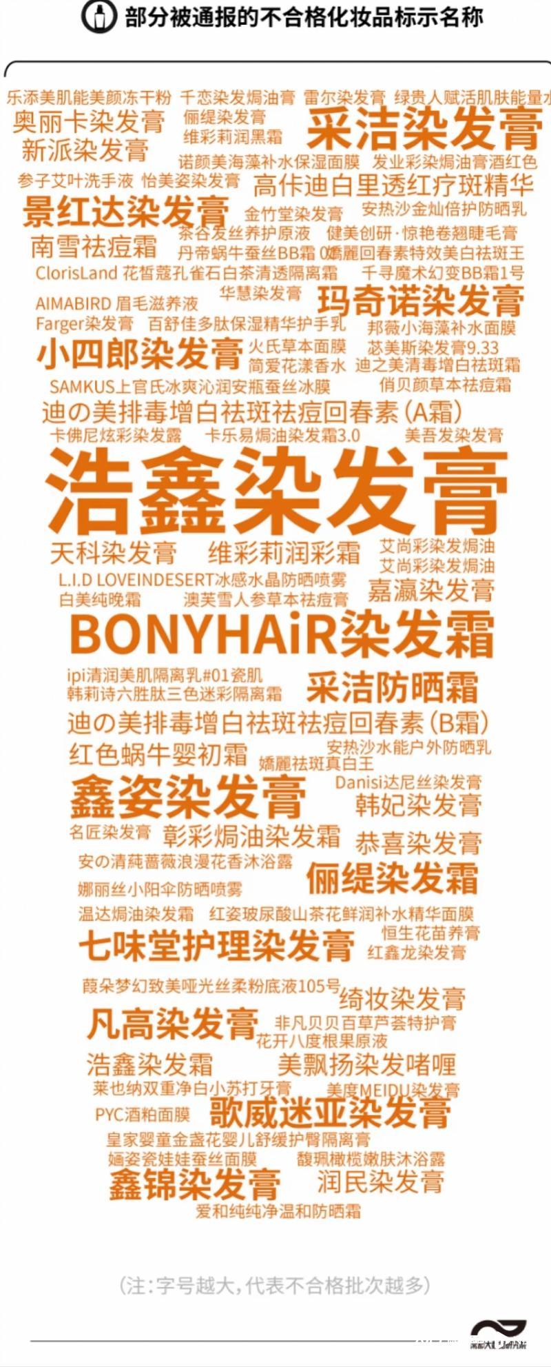 南都大数据研究院统计发现,染发膏依然是不合格重灾区,共有103批次上榜,占比接近六成。这些染发膏不合格的原因多为检出成分与批件、标签标识不一致,或者标签标识与批件不一致。其中,标示“广州市浩鑫精细化工有限公司”的浩鑫染发膏有7批次被北京、江西两地药监局通报。
