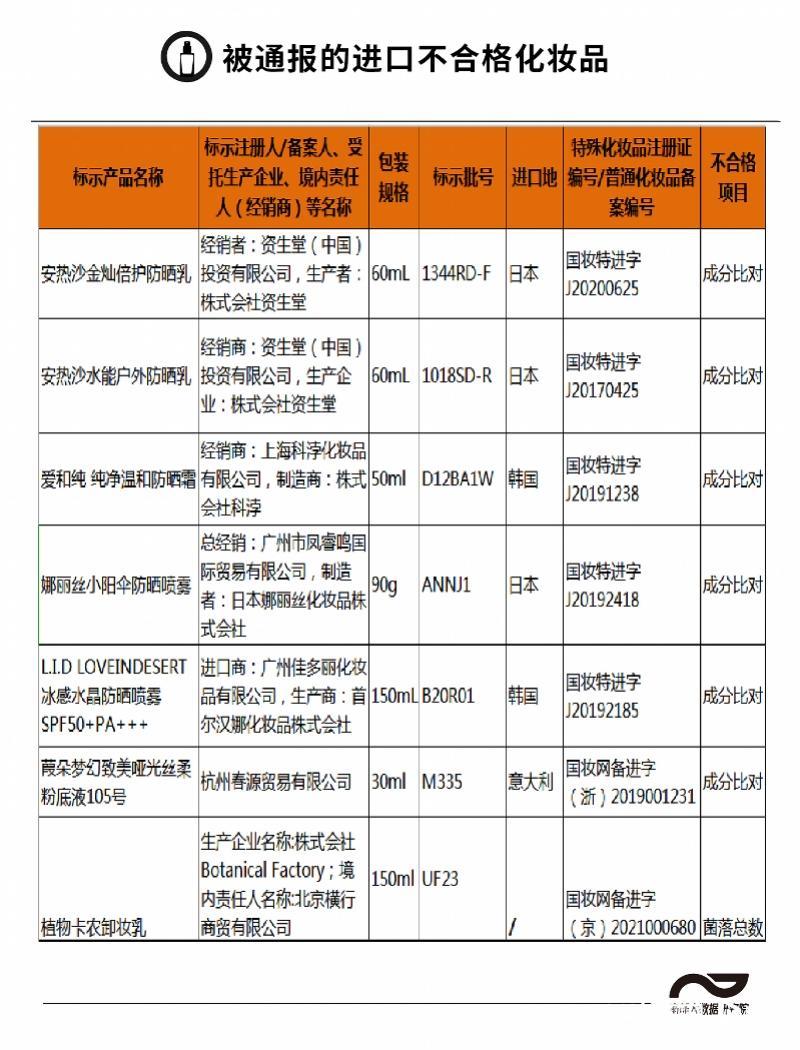 在近期官方的不合格化妆品通报中,还出现了多批次进口品牌的身影。如2022年的12月22日《药监局关于53批次不符合规定化妆品的通告》就通报了安热沙、爱和纯、娜丽丝等6批次进口化妆品。