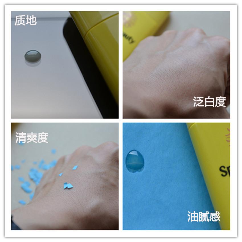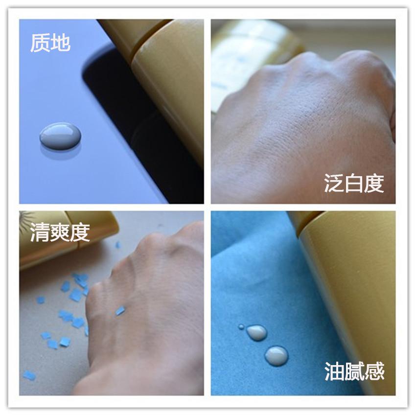 涂改液质地,含有物理防晒剂,会有很轻微的泛白,但属于看不出来的那种;成膜快;很清爽,丝毫不觉得油腻,还有的控油果;香味很清淡,说实话不好闻。