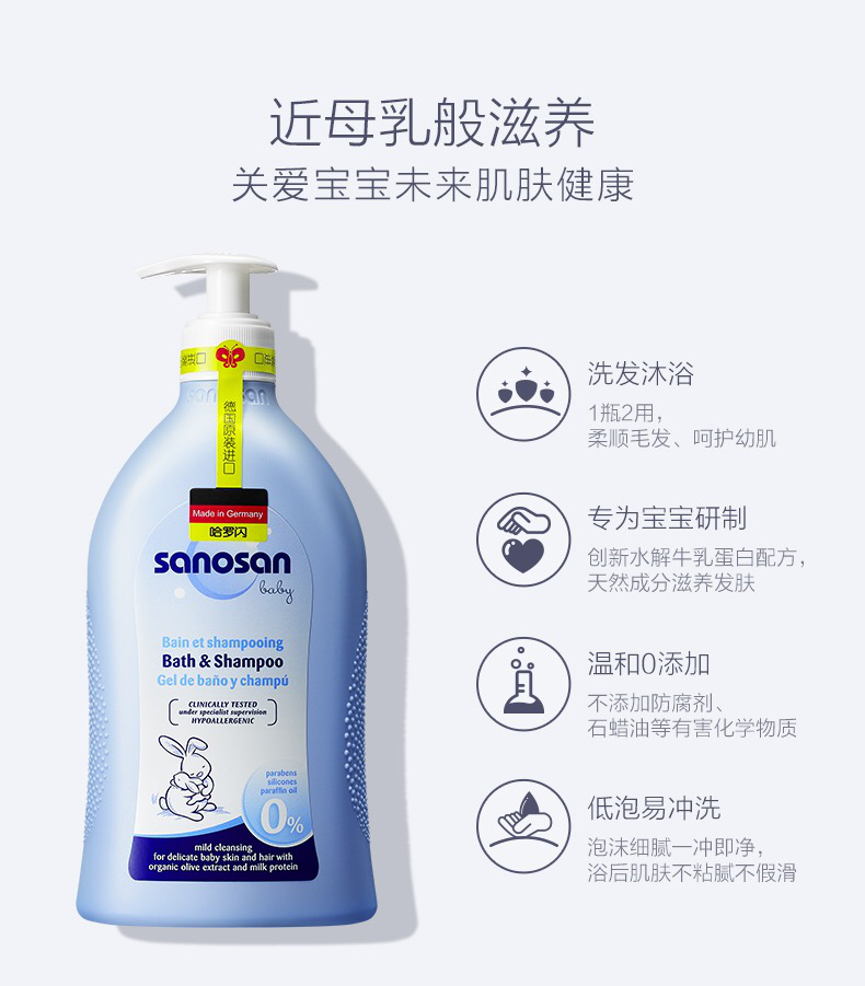 通告显示,标示为中国总经销为北京隆盛泰健康科技股份有限公司,生产商为德国万事乐德公司的哈罗闪婴儿净护二合一洗发沐浴露1批次婴幼儿护肤类产品菌落总数不合格,检验结果为610000CFU/g。值得注意的是,哈罗闪婴儿洗发沐浴露在电商平台十分常见,其电商官方旗舰店月销一万件以上。该商品的在产品页面宣称,“近母乳般滋养“。