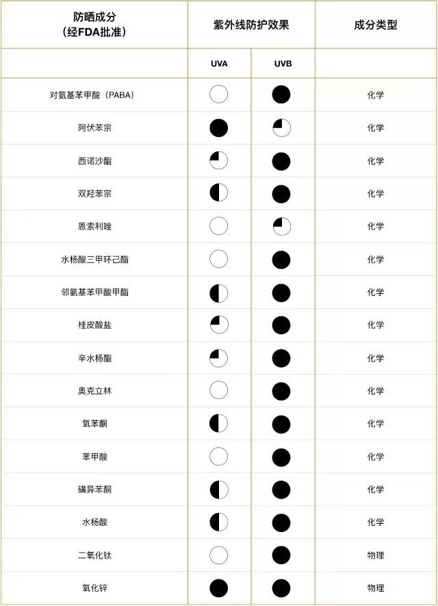 △各种成分对UVA/UVB的防护果用黑色圆点表示,果随着圆点黑色面积的减少依次递减