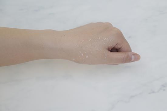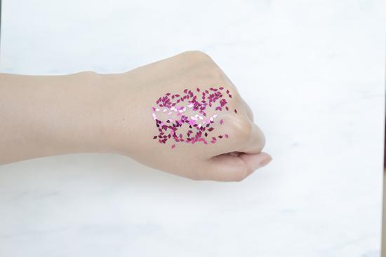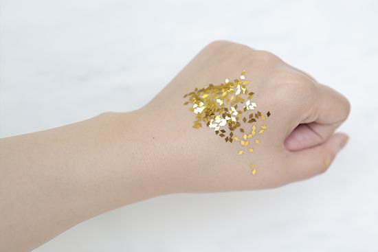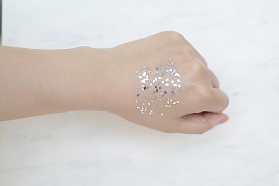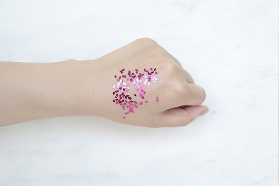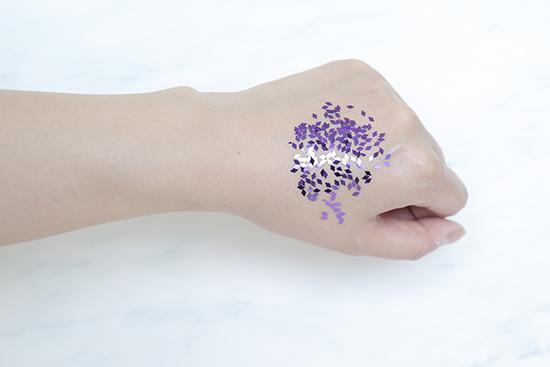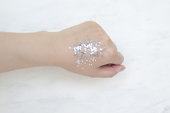 (将产品涂抹在手背上至吸收,再撒上相同数量的彩色亮片,用力甩手后,残留越少证明产品越清爽。)