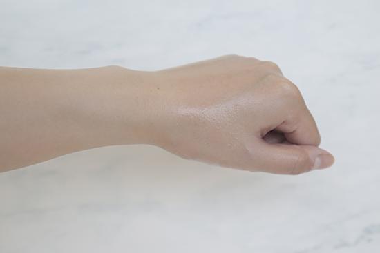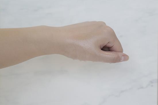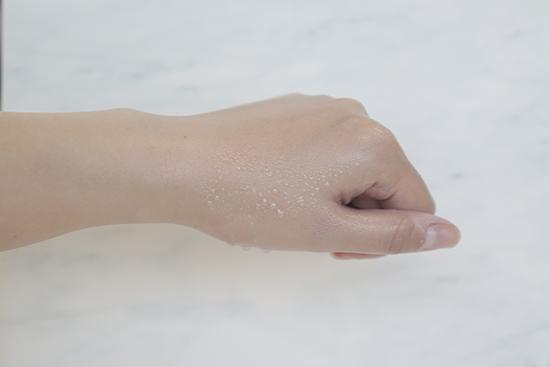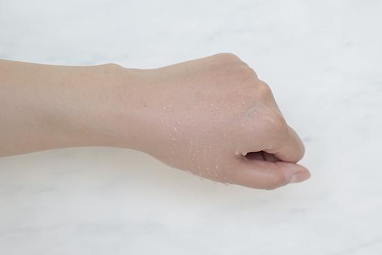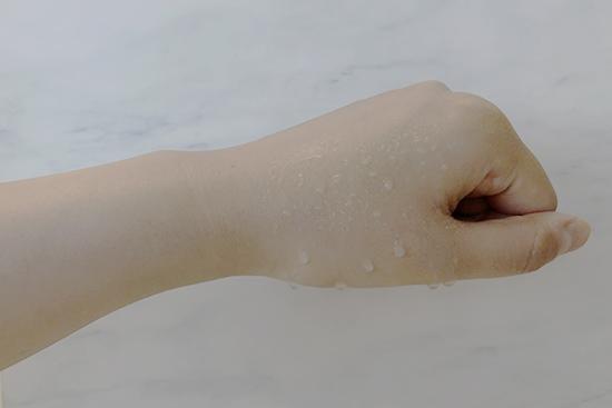(将产品涂抹在手背上至吸收,再喷上等量的水,凝结的水珠越多证明防水度越好。)