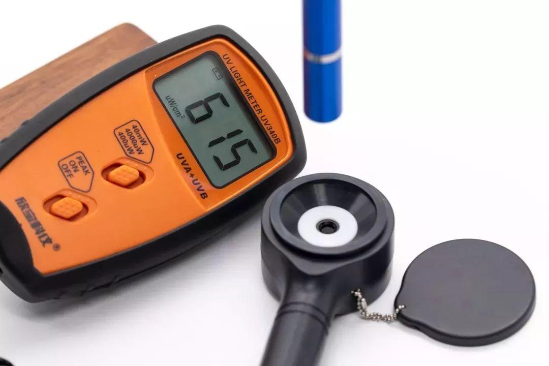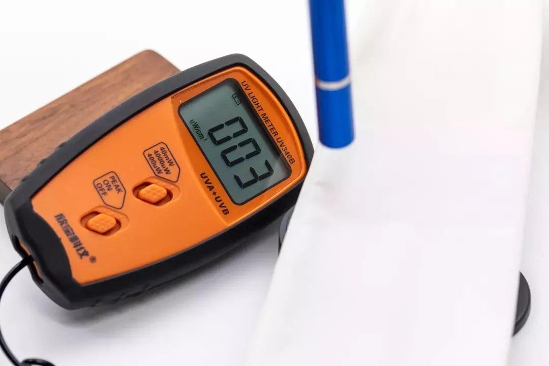 我们通过实验来验证冰袖的防紫外线能力,用紫外线照射探测器,在没有任何阻挡下,紫外线指数高,当冰袖阻挡之后,我们可以看到紫外线指数快速下降。