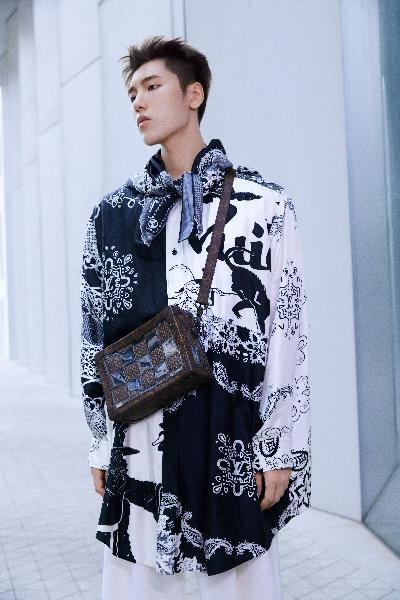 王子异身着拼接印花长衬衫搭配路易威登 Soft Trunk 手袋,叛逆展露不羁态度。脖子上系了同花色的丝巾增加了整体的氛围感和精致度。裤装上选择了简约的白色阔腿裤使造型上有一定的留白,增加了呼吸感。