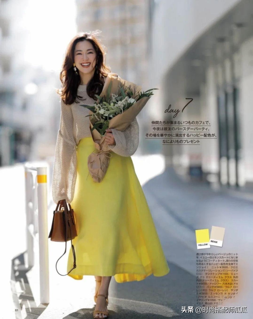 奶油黄可以与大量的基础色相搭配,它作为点缀色掺杂在其中,这样子既能够降低基础色的冷淡感,又能让穿搭看起来简约却不失时尚感,具有减龄的作用。