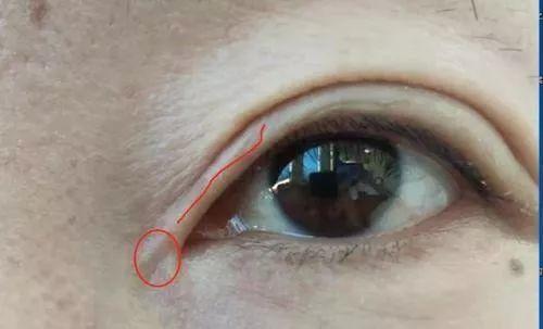 红色那条线是当时长那根线造成的疤痕增生一直下不去 眼角圈住的地方看见有黑点 还有线头