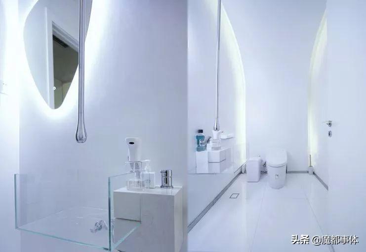 连洗手间的设计也很有设计感,水龙头像一个大水滴,洗手液等物品摆放整齐。