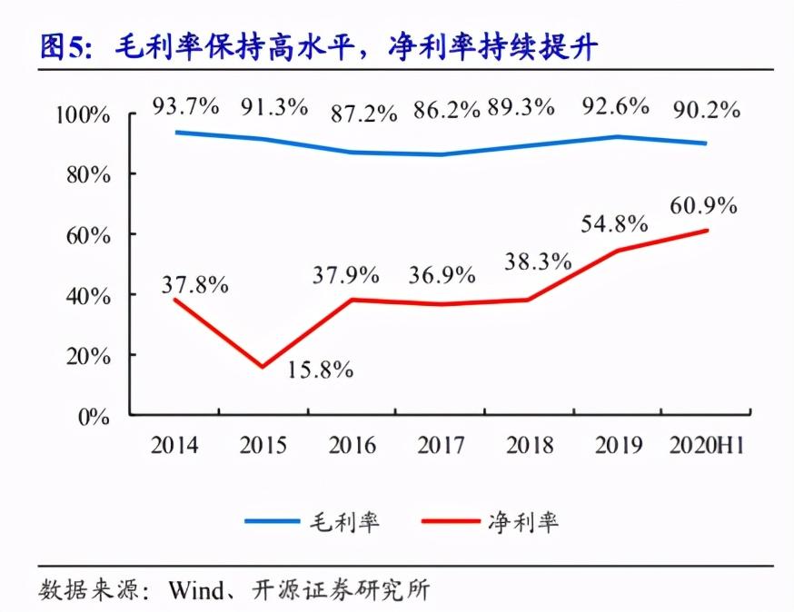 4、毛利率堪比茅台 医疗板块少有的避风港相比华熙生物和昊海生科,爱美客的主营业务相对简单,营收和净利润规模较小,但增速快。2017-2019年,公司总营收分别为2.22亿元、3.21亿元、5.58亿元,同比增速为58%、44.3%、73.7%;归母净利润同期从0.82亿元增长至3.06亿元,同比增速分别为54%、49.5%、148.7%。