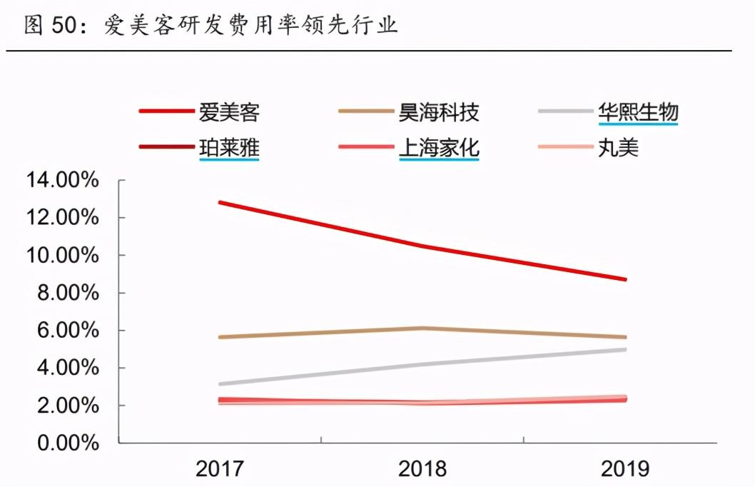 爱美客较强的研发能力,来自其对于医美行业的专注以及较高的研发费用投入。近三年,公司研发费用率接近10%,远高于同类公司。不同于同类公司在产业链纵向与横向上的广泛延伸,爱美客深耕医美领域,在研发的投入上也都沉淀在医美领域,因而其医美线的在产产品与储备在研产品都更加丰富。