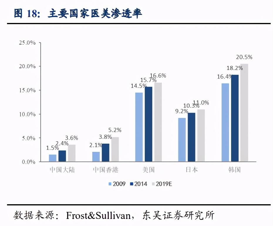 总量虽大,但从渗透率来看,我国的医美市场还有很大的发展空间。数据显示,2019 年中国医美市场渗透率约为3.6%,同期美国为16.6%,日本11%,韩国 20.5%。
