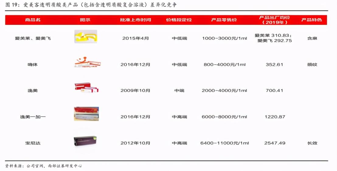 目前,共有17家公司在中国境内取得透明质酸钠注射液相关产品的医疗器械注册证书,其中海外8家、中国大陆7家、中国台湾2家。只有少数早期进入市场的爱美客、华熙生物、昊海生科能够占据一定的市场份额。