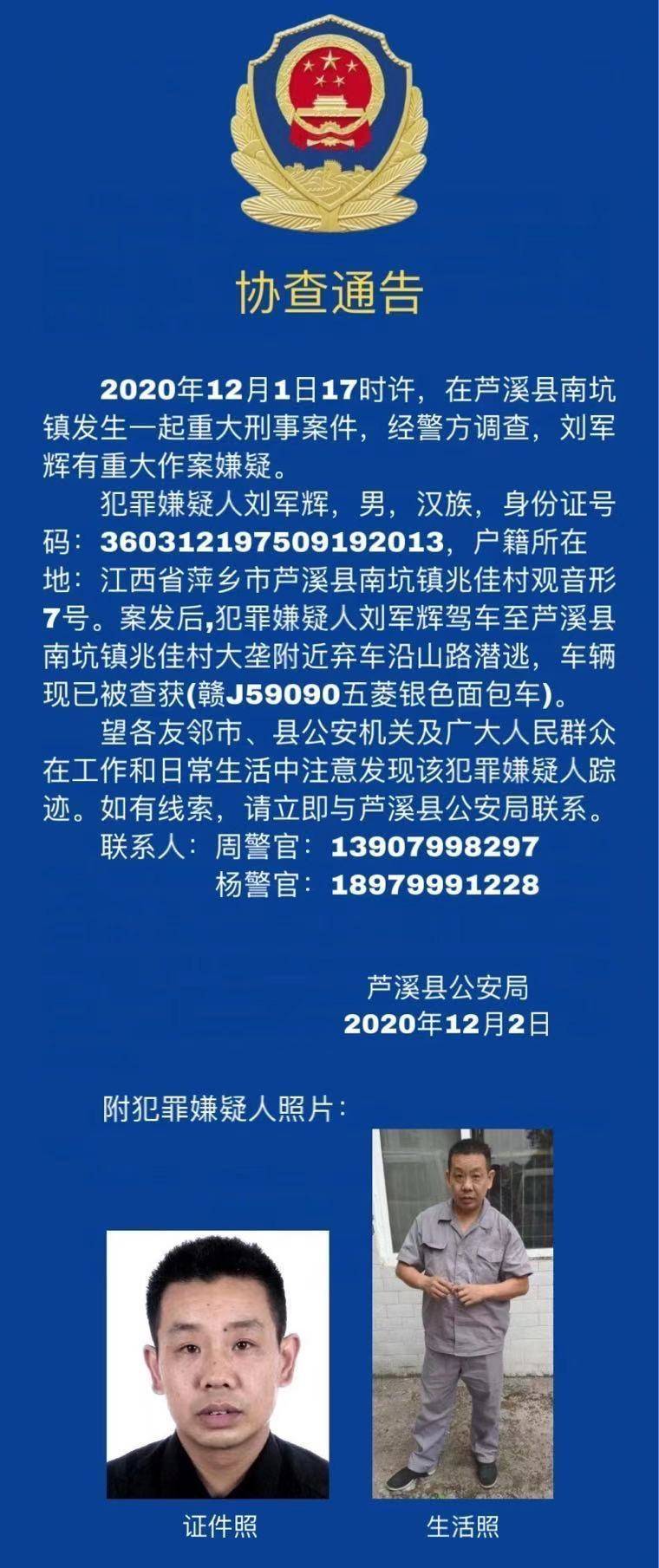 12月2日,芦溪县公安局发布“协查通报”,南坑镇上发生重大刑事案件,兆佳村村民刘军辉有重大作案嫌疑,案发后,刘军辉驾车至芦溪县南坑镇兆佳村大垄附近弃车,沿着山路潜逃,车辆已被查获,车牌为“赣J59090”的五菱银色面包车。
