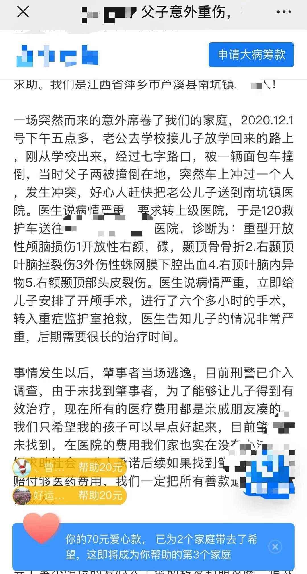 筹款信息显示,12月1号下午五点过,李某老公去学校接儿子放学回来的路上,刚从学校出来,经过七字路口,被一辆面包车撞倒,当时父子俩被撞倒在地,并被砍伤。