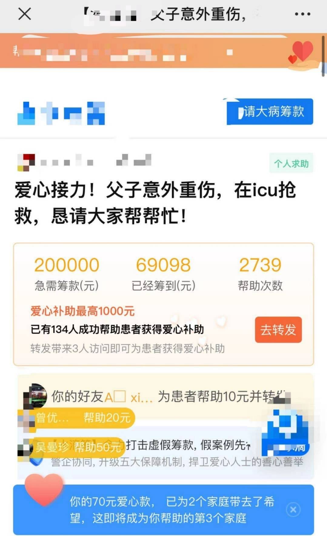记者注意到,家属在网上发起了众筹,这笔筹款信息的筹款总额为20万元,截至12月4日上午11:02分,已筹到76655元,男童的亲友在情况说明中“证实”,父子俩放学回家途中出车祸,儿子颅脑严重受伤,急需调节。