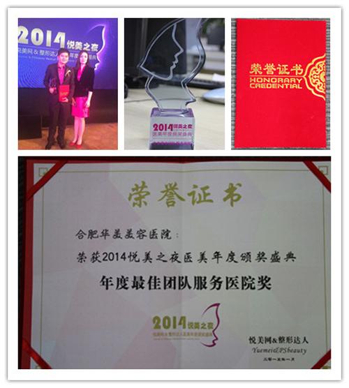 2015年1月24日,在北京希尔顿逸林酒店,被称为“医美界的奥斯卡盛典”2014悦美之夜医美年度颁奖盛典盛大开启,此次盛典是由悦美网携手台湾《整形达人》杂志主办,合肥华美整形美容医院副总经理林建平与整形美容行业的共计200多业内人士应邀参加此次盛典。颁奖典礼上,合肥华美凭借优质的医美服务荣膺“佳团队服务奖”。