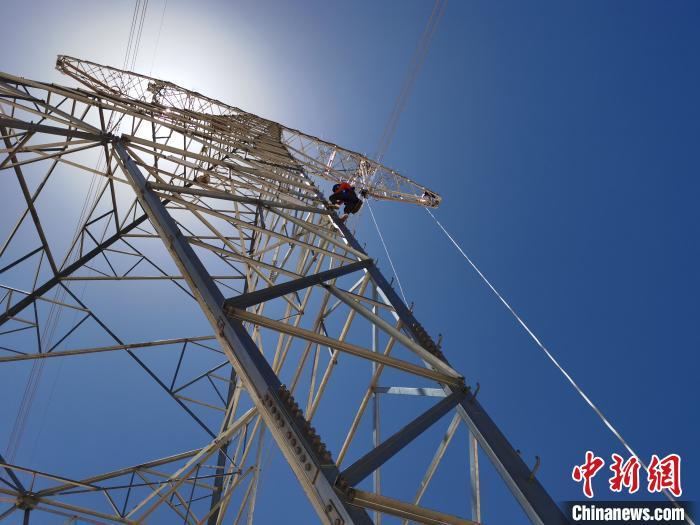图为5月17日,检修人员在海拔5700多米的五道梁检修“电力天路”。 谢莉蓉 摄