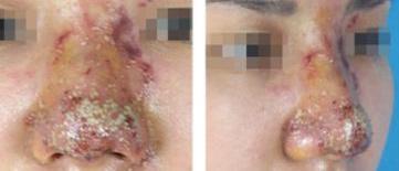 于是,小美跟着朋友来到这个所谓的专家工作室,当时注射完以后出现皮肤发白,部分红肿,注射医生告诉她没有问题,带她出去打3天消炎针就会好。但是经过后期的调节,仍然没有得到好转,而且鼻子逐渐开始发黑发烂、化脓。