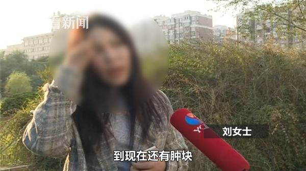 刘小姐指着自己脸说:“就是额头这一块它填多了,到现在还有(肿块),(接特写画面中的现场同期)这边感觉他填多了,法令纹特别深。”