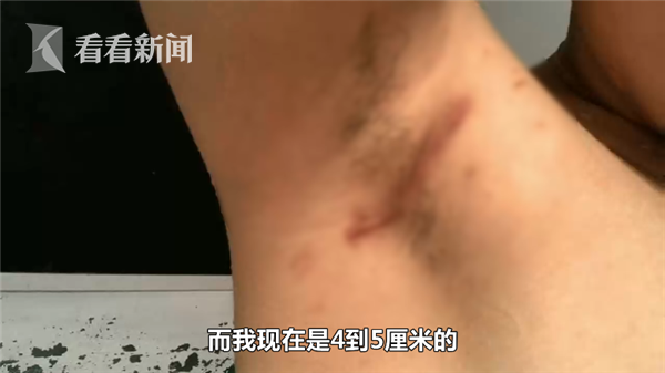 刘小姐表示,“还有假体隆胸,腋窝下(有疤痕),人家其他人做的假体隆胸,(疤痕)大概2到3厘米的伤口,而且术后半年(就好),我差不多现在已经有半年了,我现在是4到5厘米的,还增生了,就很难看。”