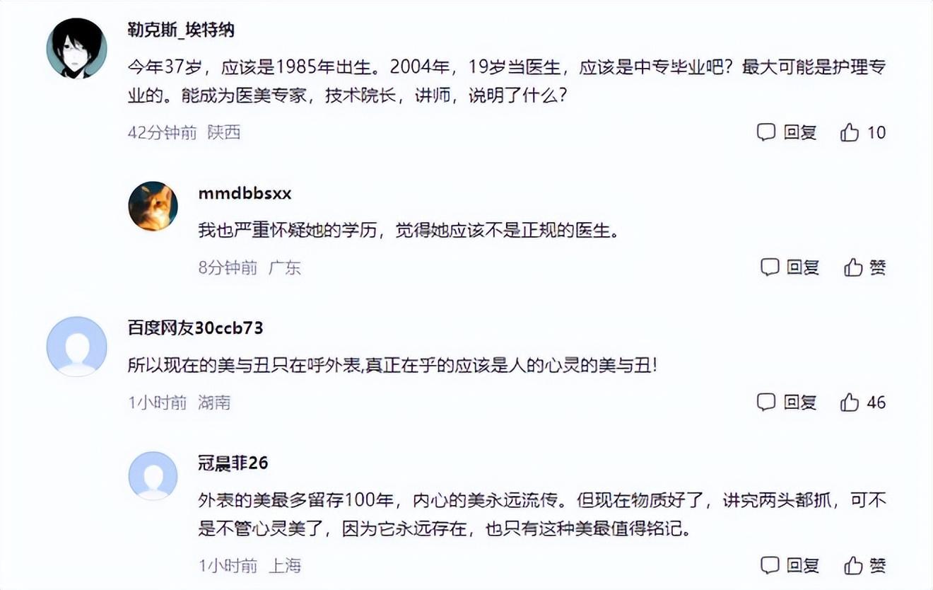 还有细心的网友表示,小丽今年37岁,应该是1985年出生。2004年,19岁当医生,应该是中专毕业吧?大可能是护理专业的。能成为医美专家,技术院长,讲师,说明了什么?